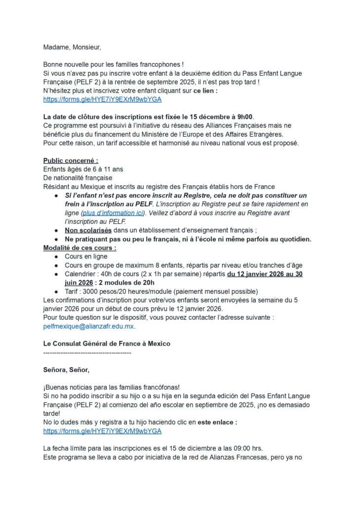 Compartimos información que nos hace llegar el Consulado General de Francia en México para apoyo a familias que tengan hijos con alguna discapacidad así cómo apoyos para niños que necesitan reforzar sus conocimientos del idioma francés.